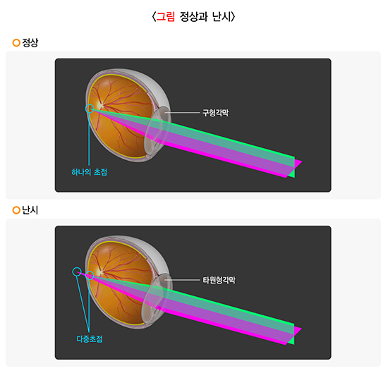 • 눈의 각막이나 수정체가 고르게 둥글지 않고 타원형처럼 비뚤어져 있어, 가까운 곳과 먼 곳 모두 흐릿하게 보이는 상태